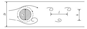 智能渦街流量計(jì)是由漩渦發(fā)生體、頻率檢測器和信號(hào)轉(zhuǎn)換器等環(huán)節(jié)組成,輸出 4 ~ 20 mADC 信號(hào)或脈沖電壓信號(hào)。其測量原理是在流動(dòng)的流體中的垂直流動(dòng)方向安放 1 根或多根非流體型阻流體,在一定的流量范圍內(nèi),流體在阻流體兩側(cè)交替地分離、釋放出 2 串頻率正比于管道內(nèi)的平均流速、規(guī)則的、不對(duì)稱有規(guī)律的交替漩渦列,如圖 1 所示,且兩側(cè)漩渦旋轉(zhuǎn)方向相反 。采用檢測元件測出漩渦頻率就可以推算出流體的流量。
